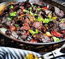 Preheat oven to 325 F. In a dutch oven pour in beef and marinade mixture, add onions and peppers, and olive oil stir until mixed. Cook at 325 F for 5 hours or until tender. Serve on corn or flour tortillas with Lola's Spices Fish sauce, top with shredded cabbage and fresh avocado or you favorite toppings!